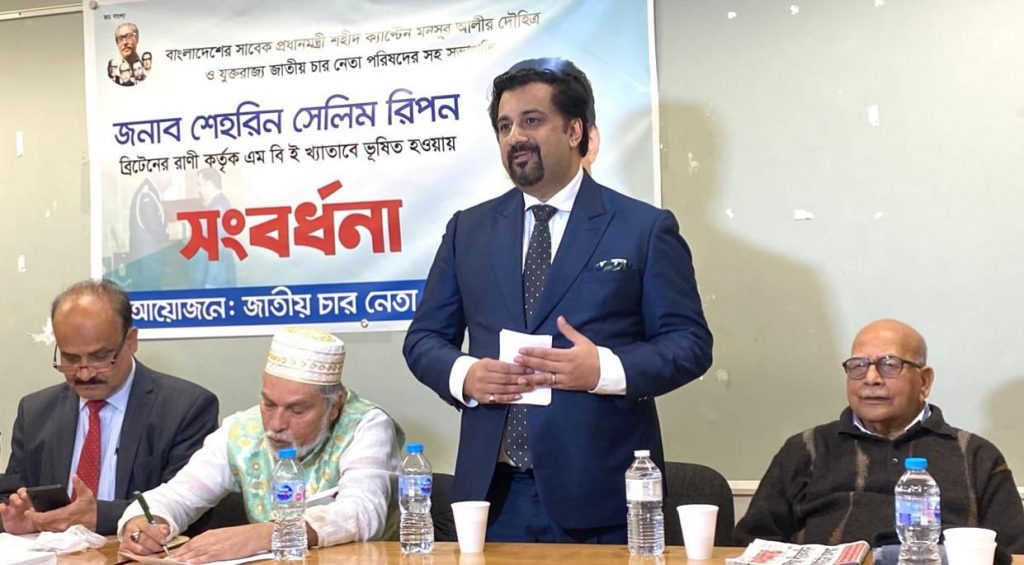 ব্রিটিশ রানির ‘এমবিই’ খেতাব অর্জন করায় জাতীয় নেতা বঙ্গবন্ধুর ঘনিষ্ঠ সহচর বাংলাদেশের সাবেক প্রধানমন্ত্রী শহীদ ক্যাপ্টেন এম মনসুর আলীর দৌহিত্র, আওয়ামী লীগের সাবেক প্রেসিডিয়াম সদস্য ড. মো. সেলিমের ছেলে শেহরিন সেলিম রিপনকে সংবর্ধনা দিয়েছে জাতীয় চারনেতা পরিষদ যুক্তরাজ্য।