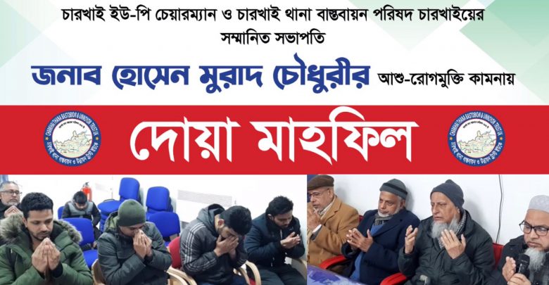 সিলেটের চারখাই ইউনিয়ন পরিষদের চেয়ারম্যান ও চারখাই থানা বাস্থবায়ন পরিষদ চারখাইয়ের সভাপতি অসুস্থ্য হোসেন মুরাদ চৌধুরীর আশু-সুস্থতা কামনায় লন্ডনে এক দোয়া এবং আলোচনা সভা অনুষ্টিত হয়েছে। ১লা ফেব্রুয়ারী বুধবার, চারখাই থানা বাস্তবায়ন ও উন্নয়ন ট্রাস্ট ইউকে’র উদ্যোগে পূর্বলন্ডনের লন্ডন বাংলা প্রেস ক্লাব কার্যালয়ে অনুষ্টিত দোয়া পূর্ব এক আলোচনা সভা সংগঠনের সভাপতি, বীর মুক্তিযুদ্ধা ফয়জুর রহমান খানের সভাপতিত্বে ও সাধারন সম্পাদক, আব্দুল কাদির চৌধুরী মুরাদের পরিচালনায় অনুষ্টিত হয়। এতে উপস্থিত ছিলেন, সংগঠনের সহসভাপতি শাহাব উদ্দিন, ট্রেজারার, আহাদ কবীর, সাংগঠনিক সম্পাদক আওলাদ চৌধুরী, ওয়াহিদ খাঁ রানা, জামিল আহমদ, মোহাম্মদ রানা, লন্ডনবাংলা প্রেসক্লাবের কার্য্যনির্বাহী সদস্য আহাদ চৌধুরী বাবু ও অন্যান্যরা। সভায় হোসেন মুরাদ চৌধুরীকে একজন তরুণ সমাজসেবী, জনদরদী ও সামাজিক উন্নয়নমূলক কর্মকান্ডে অগ্রণী ভূমিকা পালনকারী চেয়ারম্যান হিসেবে উল্লেখ করে, তাঁর দ্রুত সুস্থ্যতায় মহান আল্লাহ রাব্বুল আল-আমীনের কাছে দোয়া প্রার্থনা করা হয়। এতে দোয়া পরিচালনা করেন, মাওলানা কামাল উদ্দিন। এ সভায় চারখাই থানা বাস্তবায়নের অতীব দ্রুত সম্ভ্যতার লক্ষ্যে প্রস্তাবিত এলাকার ইতিহাস, ঐতিহ্য সংস্কৃতি,মুক্তিযুদ্বে অবদান, সর্বোপরি ১৯৪৭ সালে ভারত বিভাগ কালে জনসমর্তন আদায়ে চারখাই হয়ে বিয়ানীবাজার পরিভ্রনে স্বাধীনতার স্থপতি বঙ্গবন্ধুর প্রচারণায় ধন্য পটভূমিসহ ডকুমেন্টরী বিনির্মাণ, ম্যাগাজিন প্রকাশনা ও সংস্কৃতিক পরিমণ্ডলে আগামী মে মাসে লন্ডনে ‘চারখাই থানা বাস্থবায়ন মেলা’ উদ্যোগের কথা তুলে ধরা হয়।