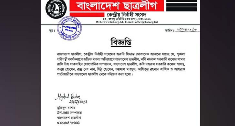 উপদপ্তর সম্পাদক বাশার জানান, বাংলাদেশ ছাত্রলীগ, কেন্দ্রীয় নির্বাহী সংসদের জরুরি সিদ্ধান্ত মোতাবেক শৃঙ্খলা পরিপন্থি কার্যকলাপে জড়িত থাকার অভিযোগে কবি নজরুল সরকারি কলেজ শাখার সাংগঠনিক সম্পাদক রাফি উজ সাকলাইন, তন্ময় হোসেন, রুদ্র দেব নাথ, মিঠু হোসেন, ফয়সাল মাহমুদ, আশিকুর রহমান আশিক ও আশরাফ পাটোয়ারীকে বাংলাদেশ ছাত্রলীগ থেকে বহিষ্কার করা হয়েছে।