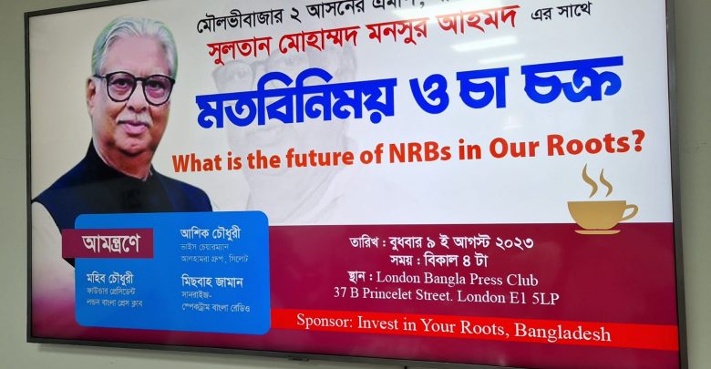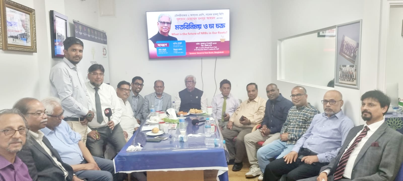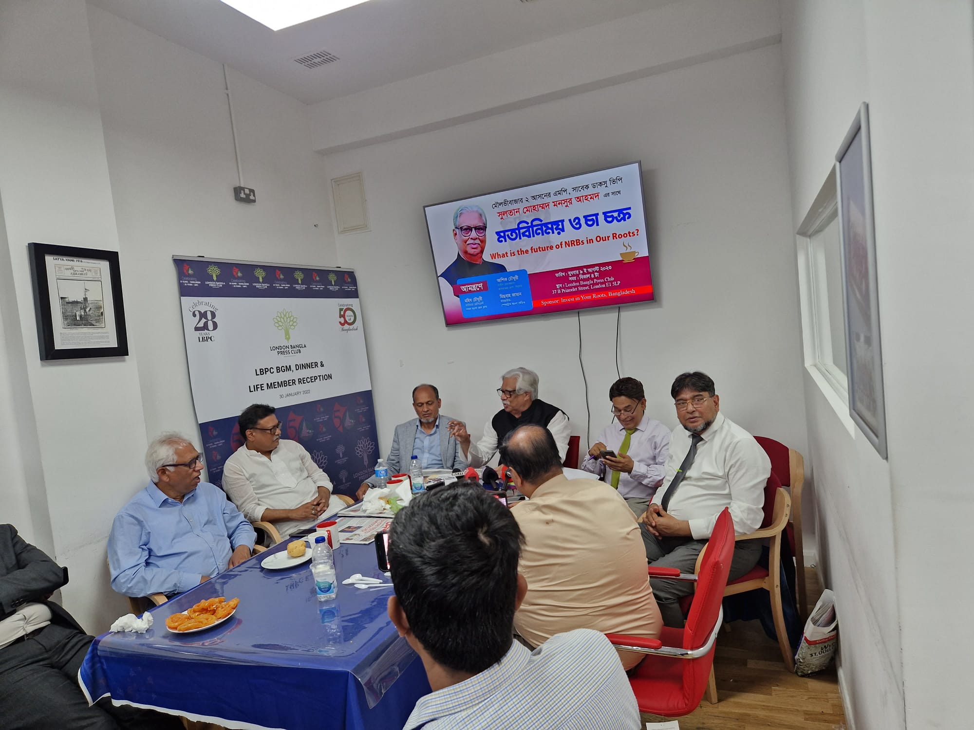 লন্ডন বাংলা প্রেস ক্লাবের ফাউন্ডার প্রেসিডেন্ট মহিব চৌধুরীর সভাপতিত্বে ও মিডিয়া বাক্তিত্ব মিছবাহ জামালের পরিচালনায় ইনভেস্ট ইন ইউর রুটস ইন বাংলাদেশ ও আ হামরা ভাইস চেয়ারম্যান আশিক চৌধুরীর সহযোগিতায় মত বিনিময়ের শুরুতে স্বাগত বক্তব্য রাখেন লন্ডন বাংলা প্রেস ক্লাবের ফাউন্ডার সেক্রেটারি নজরুল ইসলাম বাসন। তার একে একে উপস্থিত সকল সাংবাদিক ও আমন্ত্রিত অতিথিদের পরিচিতি তুলে ধরে বক্তব্য রাখেন ক্লাবের সাবেক প্রেসিডেন্ট ও কমনওয়েলথ জানালিষ্ট এসোসিয়েশনের ভাইস প্রেসিডেন্ট সৈয়দ নাহাস পাশা, প্রেস ক্লাবের পক্ষে বিশিষ্ট সাংবাদিক যারা বক্তব্য রাখেন যথাক্রমে ভাইস প্রেসিডেন্ট রহমত আলী, ট্রেজারার সালেহ আহমদ, এসিস্টেন্ট সেক্রেটারি সায়েম চৌধুরী, এসিস্ট্যান্ট ট্রেজারার এম এ কাইয়ূম, মিডিয়া এন্ড আইটি সেক্রেটারী এম এ হান্নান, ইভেন্ট এন্ড ফেসিলিটিস সেক্রেটারি রেজাউল করিম মৃধা, এক্সিকিউটিভ মেম্বার আহাদ চৌধুরী বাবু, এক্সিকিউটিভ মেম্বার ও আরটিভির সারোয়ার হোসেন, সিনিওয়র সাংবাদিক আব্দুল মুনিম জাহেদি কারল, এলবি ২৪ প্রতিনিধি ফরিদ উদ্দিন, এনটিভির খালেদ মাসুদ রনি, বিশিষ্ট কমিউনিটি বাক্তিব বাবসায়ী আজমল হোসেন, বিশিষ্ট রাজনীতিবিদ নজরুল ইসলাম, রেডব্রীজ কমিউনিটি ট্রাষ্টের প্রেসিডেন্ট অহিদ উদ্দিন ওয়ারিছ আলি, বিশিষ্ট রেডিও ও টিভি উপস্হাপক শাহাব আহমদ বাচ্চু, আব্দুর রউফ, তালুকদার, মুহিবুর রহমান, আব্দুল এ বাবুল, ইমরান আহমদ, প্রমুখ নেতৃবৃন্দ।