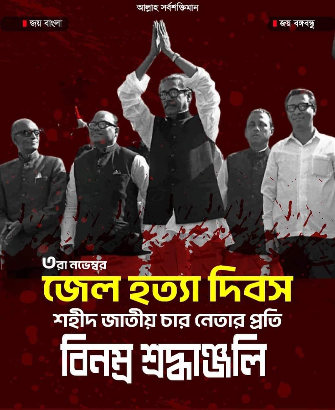 বাংলাদেশ স্বাধীনতা পর চার বছরের মাথায় ১৯৭৫ সালে ১৫ই আগষ্ট জাতির জনককে সপরিবার হত্যার মধ্য দিয়ে বাঙালি জাতির ইতিহাসে যে কলংকময় অধ্যায় এর সূচণা করছিলো সেই ঘাতকচক্র বাঙালী জাতিকে নেতৃত্বশূন্য করতে ১৯৭৫ সালের ৩ নভেম্বর মধ্যরাতে ঢাকা কেন্দ্রীয় কারাগারে অন্তরীণ জাতির চার মহান সন্তানকে নির্মম ও নৃশংসভাবে হত্যা করে জাতির ইতিহাসে দ্বিতীয় কলংকজনক অধ্যায়ের জন্ম দেয়। কারাগারের নিরাপদ আশ্রয়ে থাকা অবস্থায় এমন জঘন্য,কলঙ্কিত,হৃদয়বিদারক নৃশংস ও বর্বরোচিত হত্যাকান্ড বিশ্বের ইতিহাসে বিরল। স্বাধীন বাংলাদেশের যে কয়টি দিন চিরকাল কালো দিন হিসেবে চিহ্নিত হয়ে থাকবে, তার একটি ৩ নভেম্বর।জাতির চার উজ্জ্বল নক্ষত্র. যারা বারবার জাতিকে নেতৃত্ব দিয়েছেন। বিশেষ করে জাতির জনক বঙ্গবন্ধু শেখ মুজিবুর রহমান কারারুদ্ধ থাকাকালে বা তাঁর অবর্তমানে ও নিদর্শিত পথে মুক্তিযুদ্ধের নেতৃত্ব দানকারী অন্যতম পরিচালক হিসাবে সর্বজন শ্রদ্ধেয় জাতীয় চার নেতাই আওয়ামী লীগের নেতৃত্বে দল-মত নির্বিশেষে সকলকে ঐক্যবদ্ধ করে নয় মাস রক্তক্ষয়ী যুদ্ধের মাধ্যমে অপূর্ব দক্ষতার সাথে স্বাধীন বাংলার প্রথম সরকার পরিচালনা করেন ও বিজয় ছিনিয়ে আনেন।