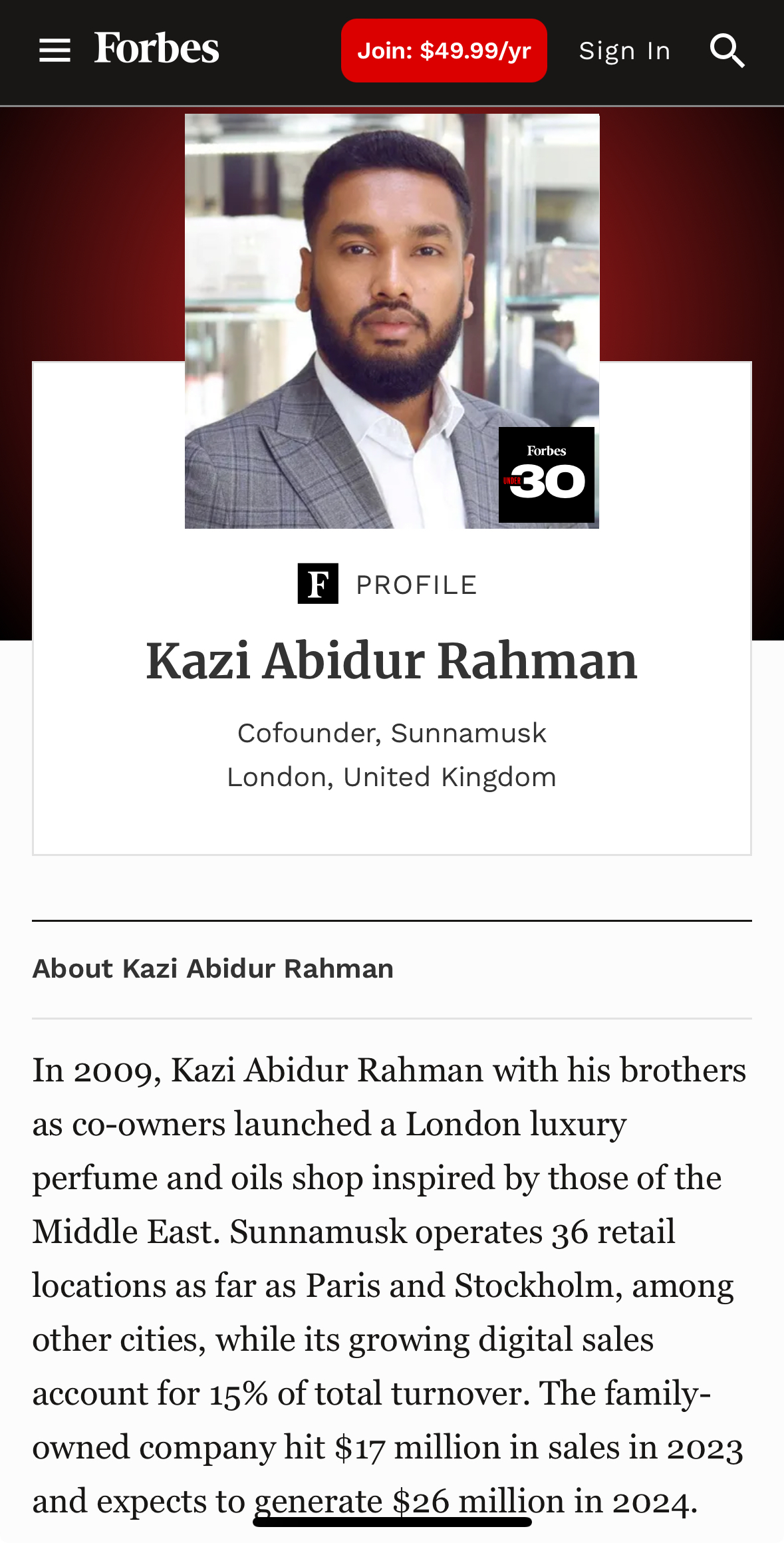 সুপরিচিত মার্কিন ম্যাগাজিন ‘ফোর্বস’-এর তৈরি করা কম বয়সী উদ্যোক্তা ও সমাজ পরিবর্তনকারী (চেঞ্জমেকার) ২০২৪ সালের তালিকায় স্থান পেয়েছেন ব্রিটিশ বাংলাদেশি তরুণ কাজী আবিদুর রহমান। তিনি ইউকের নামীদামী ফারফিউম ব্রান্ড সুন্না মাসকের কো ফাউন্ডার।