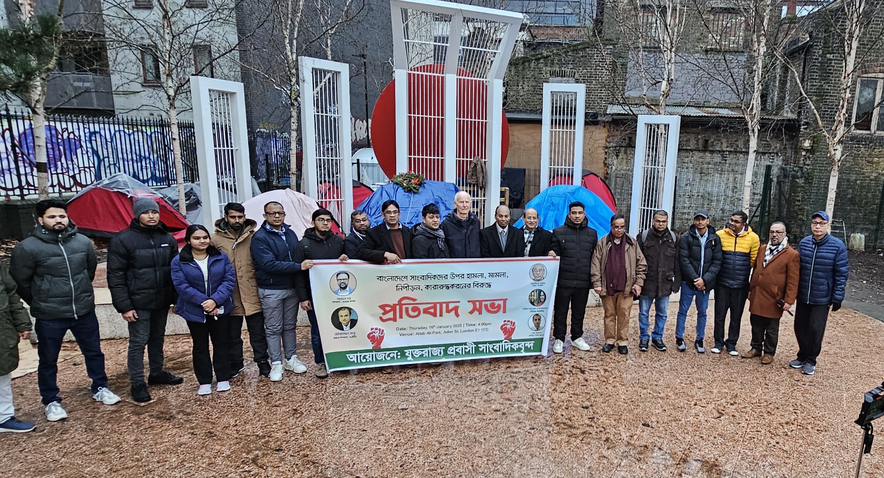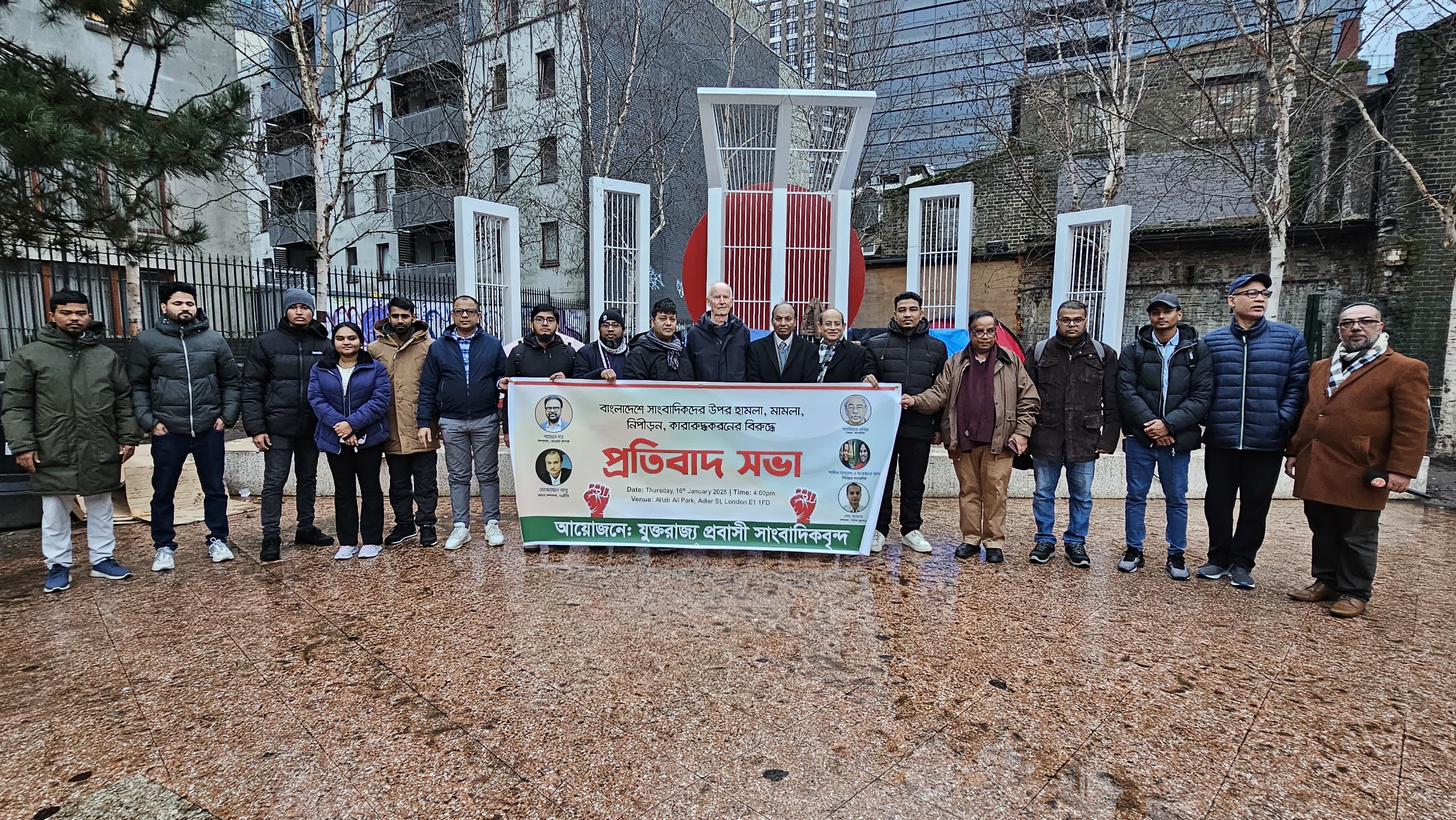 বাংলাদেশে কারারুদ্ধ সাংবাদিকদের নিশর্ত মুক্তির দাবিতে বৃহস্পতিবার বিকাল ৪ টায় স্হানীয় পুর্ব লন্ডনে আলতাব আলী পার্কে প্রবাসী সাংবাদিকদের যৌথ উদ্যোগে অনুষ্টিত হয় এ প্রতিবাদ দৈনিক ভোরের কাগজের যুক্তরাজ্য প্রতিনিধি ড.আজিজুল আম্বিয়ার সভাপতিত্বে এবং এটিএন বাংলা ইউকের স্টাফ রিপোর্টার কামরুল আই রাসেল এর পরিচালনায় প্রতিবাদ সভায় প্রধান অতিথি হিসেবে বক্তব্য রাখেন কমনওয়েলথ জার্নালিস্ট এসোসিয়েশন এর প্রবীণ সাংবাদিক ও এক্সিকিউটিভ কমিটির সদস্য রিচার্ড বর্ন।