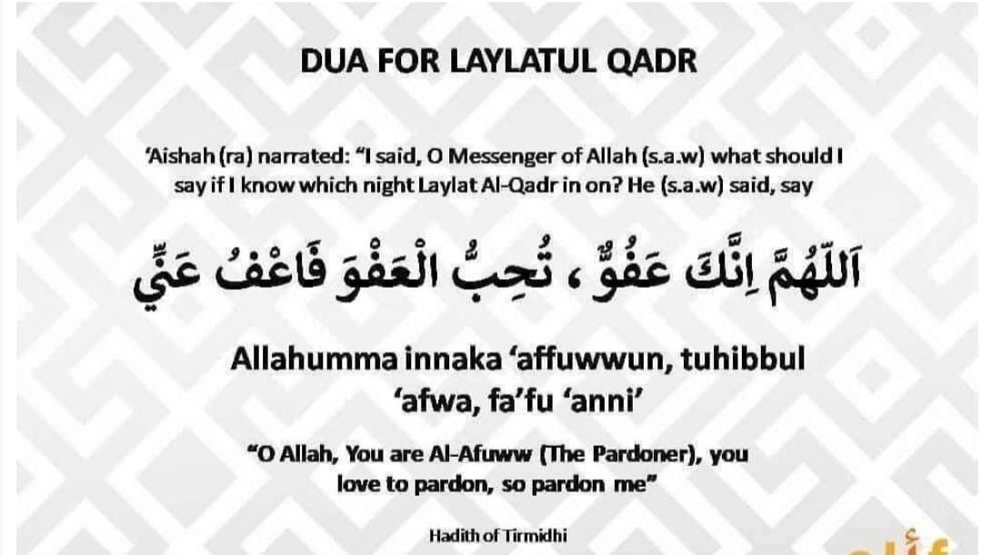 হজরত আয়েশা রাদিয়াল্লাহু আনহা বর্ণনা করেন, একবার আমি রাসুলুল্লাহ সাল্লাল্লাহু আলাইহি ওয়া সাল্লামকে জিজ্ঞাসা করলাম- হে আল্লাহর রাসুল! (সাল্লাল্লাহু আলাইহি ওয়া সাল্লাম) আপনি বলে দিন, আমি যদি লাইলাতুল কদর কোন রাতে হবে তা জানতে পারি, তাতে আমি কী (দোয়া) পড়বো?