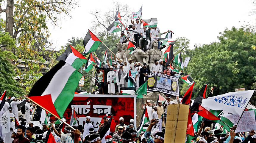 অসংখ্য পতাকা আর শ্লোগানে মুখরিত ঢাকায় যেন প্রমাণ হলো,মানবিক মূল্যবোধ সম্পন্ন শতকোটি মানুষের প্রতিরোধে খুব শীঘ্রই পর্যুদস্ত হবে ইজরায়েলি বর্বরতা।