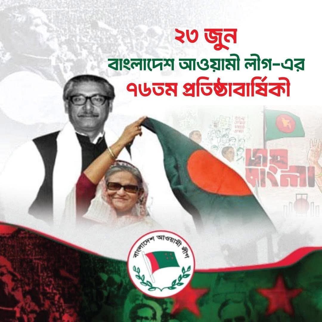 এই দুঃসময়ে দলের নেতাকর্মী এবং শান্তিপ্রিয় জনগণকে মনোবল ধরে রাখার পাশাপাশি এগিয়ে যেতে হবে দৃঢ়তার সাথে,আজ এই ক্রান্তিলগ্নে বাড়ি-ঘর ছাড়া, দেশ ছাড়া, কারাগারে থাকা সকলকে গৌরব ও সংগ্রামের ৭৬তম প্রতিষ্ঠাবার্ষিকীতে প্রতিষ্ঠালগ্ন থেকে বাংলাদেশ আওয়ামীলীগের অগণিত সৎ ও ত‍্যাগী নেতা কর্মী, ভক্ত-সমর্থক ও শুভাকাঙ্খীসহ বাংলাদেশ আওয়ামীলীগের সর্বস্তরের নেতাকর্মীদেরকে মুজিবীয় শুভেচ্ছা ও প্রাণঢালা অভিনন্দন এবং সকল শহীদানদের প্রতি গভীর শ্রদ্ধাঞ্জলি জানাচ্ছি।