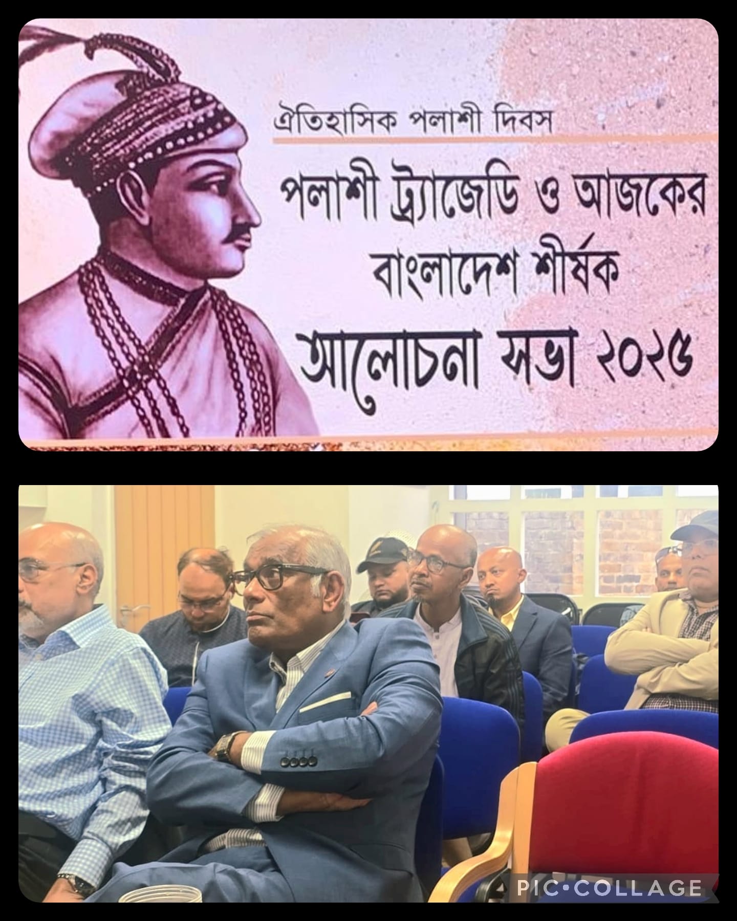 ঐতিহাসিক পলাশী দিবস উপলক্ষ্যে গত ২৩ জুন, সোমবার, বিকাল ৫.০০ ঘটিকায় ‘অখণ্ড বাংলাদেশ আন্দোলন’ এর উদ্যোগে লন্ডন বাংলা প্রেস ক্লাব মিলনায়তনে “পলাশী ট্র্যাজেডি ও আজকের বাংলাদেশ” শীর্ষক আলোচনা সভা অনুষ্ঠিত হয়েছে।